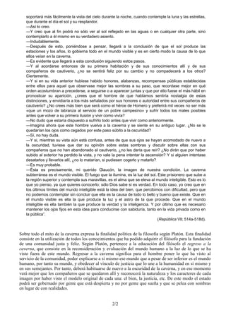 El mito de la caverna de Platón describe una alegoría en la que los prisioneros de una caverna solo pueden ver sombras en la pared producidas por objetos que pasan detrás de ellos. Esto representa cómo los seres humanos perciben el mundo a través de sus sentidos en lugar de comprender las formas ideales. Un prisionero es liberado y descubre el mundo real, pero luego regresa a la caverna para enseñar a los demás sobre lo que ha aprendido. Según Platón, este mito expresa cómo los filósofos deb