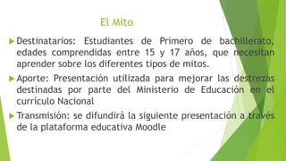 Este documento presenta información sobre los diferentes tipos de mitos para estudiantes de primer año de bachillerato. Explica que los mitos son relatos tradicionales sobre personajes sobrenaturales que comparten características como ser imaginativos y de autor desconocido. Luego describe varios tipos de mitos, incluyendo mitos teogónicos sobre los dioses, cosmogónicos sobre el origen del mundo, antropogónicos sobre el origen del hombre, del paraíso, soteriológicos, escatológicos, morales, y fund