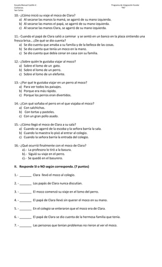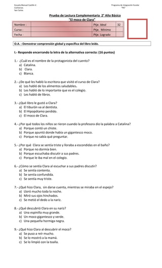 Este resumen describe un examen de comprensión lectora sobre el cuento "El moco de Clara". El examen contiene preguntas de selección múltiple y verdadero/falso sobre detalles del cuento, como que Clara descubre un gran moco verde en su nariz y este comienza un viaje agarrándose a diferentes personas y objetos hasta llegar al salón de Clara.
