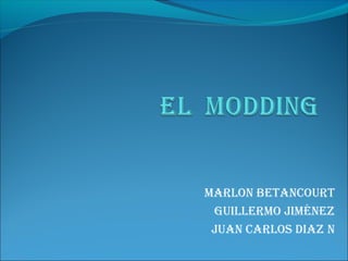 El modding es la técnica de modificar la estética y funcionamiento de computadores y sus periféricos. Se originó en los años 90 cuando los estudiantes comenzaron a personalizar sus gabinetes grises. Requiere imaginación, creatividad y conocimientos técnicos. Llegó a Colombia en 2007 durante eventos de juegos en línea donde los gamers modificaban sus computadores para mejorar el rendimiento y lucir sus creaciones.