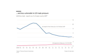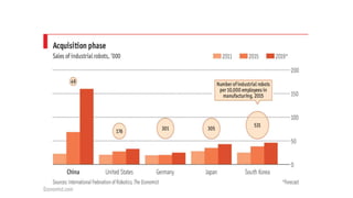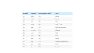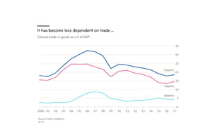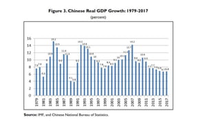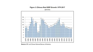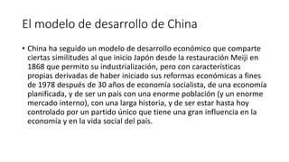 El documento analiza el modelo de desarrollo económico de China, que ha seguido un enfoque similar al de Japón en su industrialización, pero adaptado a su contexto político y social bajo un partido único. Desde 1978, China ha experimentado un crecimiento sostenido, convirtiéndose en la segunda economía más grande del mundo y un importante jugador en el comercio global. A través de reformas económicas y un fuerte control estatal, el país busca consolidarse como una potencia líder para 2049 con proyectos estratégicos como la Iniciativa de la Franja y la Ruta.
