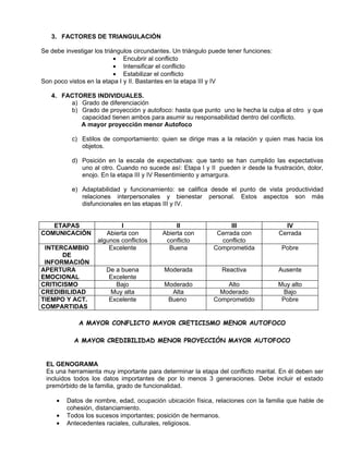 Este modelo evalúa las etapas del conflicto marital a través de un genograma y terapia de pareja. Identifica cuatro etapas del conflicto basadas en factores como la comunicación, credibilidad y criticismo entre la pareja. La Etapa I implica conflictos mínimos resueltos a través de educación. La Etapa II presenta un conflicto moderado tratado mediante ejercicios de acercamiento y distanciamiento. Las Etapas III y IV exhiben mayores problemas requiriendo terapia directa.