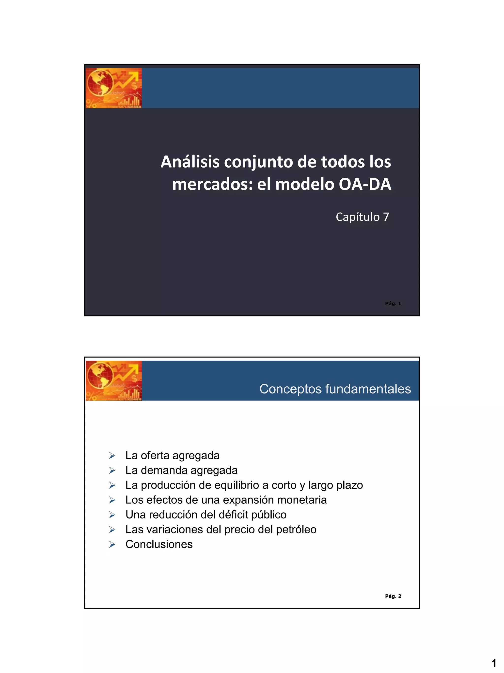 Este documento resume el modelo macroeconómico de oferta y demanda agregada (OA-DA). Explica los conceptos fundamentales de OA y DA, incluida la determinación de la producción de equilibrio a corto y largo plazo. Luego analiza los efectos de una expansión monetaria, una reducción del déficit público y variaciones en el precio del petróleo en la economía. Finalmente, discute cuánto duran los efectos reales del dinero según el modelo de Taylor.