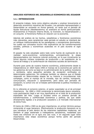 Este documento resume la historia económica del Ecuador desde su independencia en 1824 hasta la década de 1980. Se divide en tres períodos principales: el período agroexportador desde 1824 hasta 1950, el período de industrialización sustitutiva de importaciones desde 1950 hasta la década de 1980, y la crisis económica y ajuste estructural de los años 1980. El documento analiza factores como el PIB, la inversión, la industrialización y su relación con los fenómenos políticos en cada período.