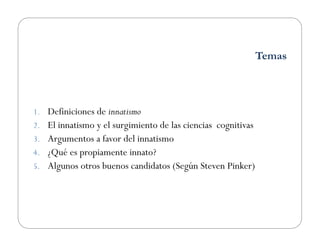 Este documento presenta una sesión sobre el modelo innatista. Define el innatismo débil como la existencia de sistemas de aprendizaje innatos y el innatismo fuerte como el conocimiento incorporado desde el nacimiento. Discute que el innatismo surgió con las ciencias cognitivas y ofrece argumentos a su favor como comportamientos universales y capacidades tempranas. Finalmente, identifica varios tipos de conocimiento y habilidades que podrían ser innatos, como la facultad del lenguaje y nociones numéricas.