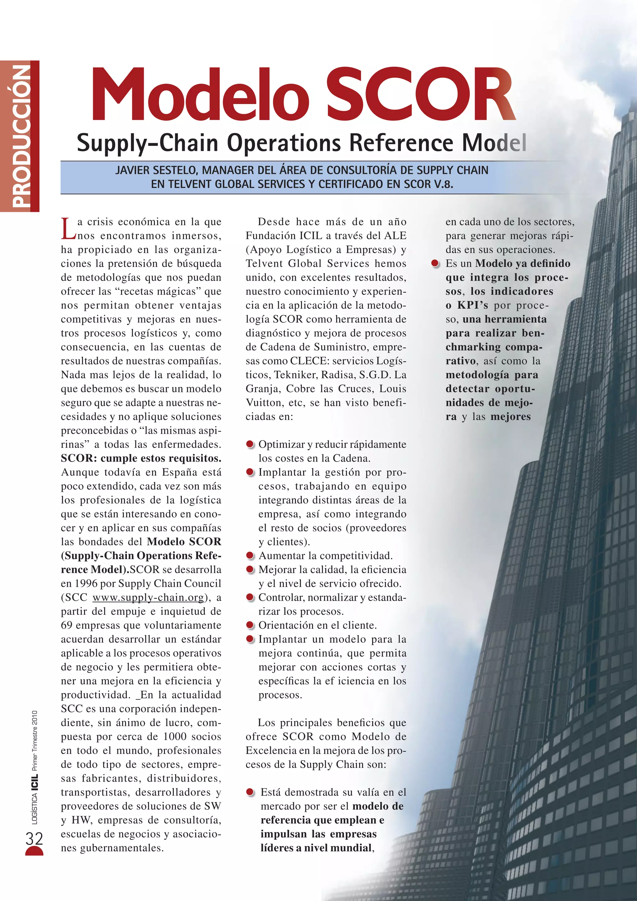 El documento describe el modelo SCOR (Supply Chain Operations Reference Model) como una metodología para mejorar los procesos de la cadena de suministro. SCOR fue desarrollado en 1996 y actualmente es utilizado por empresas líderes a nivel mundial. El modelo proporciona un lenguaje común para los procesos clave de la cadena de suministro, indicadores de rendimiento y una metodología para identificar oportunidades de mejora. Varias empresas españolas han utilizado con éxito SCOR para optimizar costos, mejorar la eficiencia y aumentar