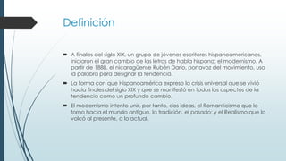 El documento describe las características principales del Modernismo, un movimiento literario que surgió a finales del siglo XIX en Hispanoamérica. Se basó en el Parnasianismo y el Simbolismo, reaccionando contra el subjetivismo romántico y el realismo. Se caracterizó por ampliar la libertad creativa, el cosmopolitismo y la renovación de recursos expresivos. Sus temas principales fueron la modernidad, el arte y la innovación del lenguaje. Los géneros más representativos fueron la poesía, el ensay