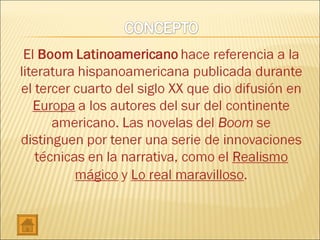El documento proporciona una introducción al modernismo como movimiento literario que surgió a finales del siglo XIX e inicios del XX. Explica sus orígenes, características y representantes más importantes como Rubén Darío. También describe el boom latinoamericano de la segunda mitad del siglo XX, con autores como García Márquez, Cortázar y Vargas Llosa. Finalmente, incluye enlaces a recursos adicionales sobre estos temas.