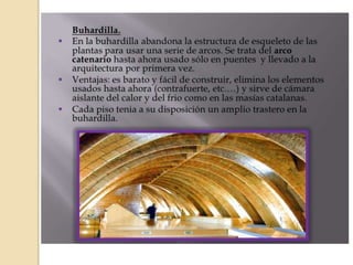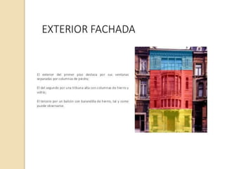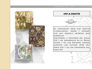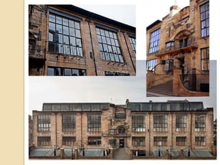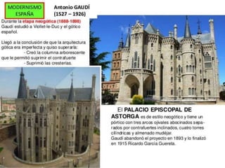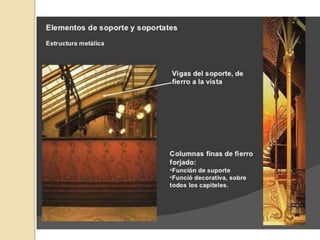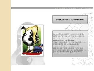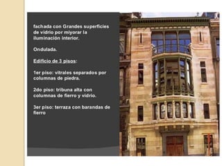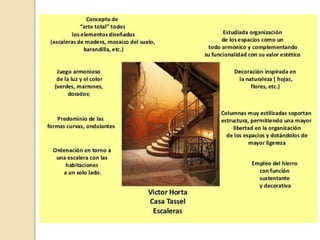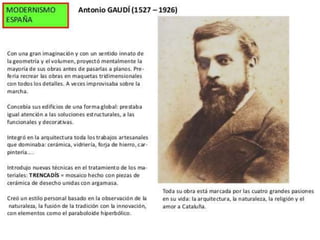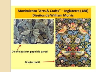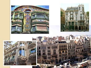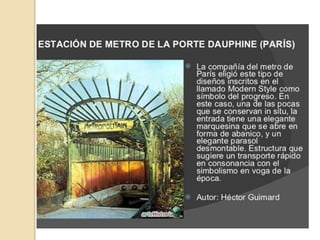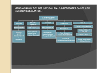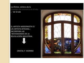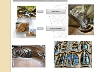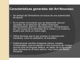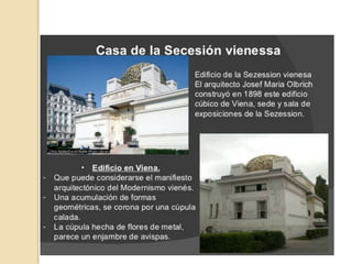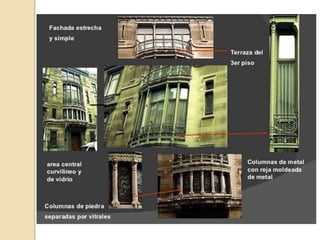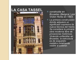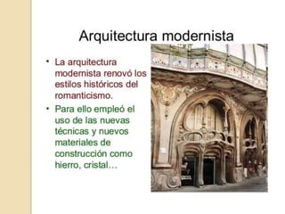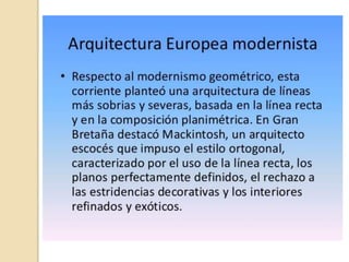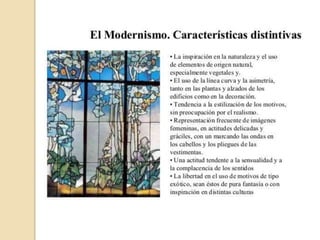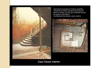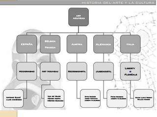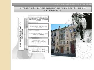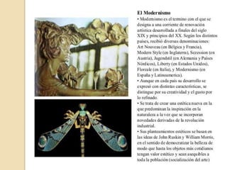 El Modernismo fue un movimiento cultural que surgió a finales del siglo XIX e inicios del XX en Europa como reacción al historicismo y academicismo imperantes, buscando un estilo moderno acorde a los nuevos tiempos. Se caracterizó por inspirar su arquitectura y artes decorativas en las formas orgánicas de la naturaleza, haciendo un uso innovador de materiales como el hierro y el vidrio. Tuvo variantes regionales como el Art Nouveau en Francia y Bélgica, destacando la obra pionera de Victor Horta.