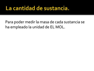 El documento explica el concepto de mol y cómo se usa para medir la masa de sustancias y elementos químicos. Un mol representa 6.022x1023 átomos, moléculas o iones de un elemento o compuesto. La masa molar de un elemento o compuesto es la masa en gramos de 1 mol de ese elemento o compuesto.