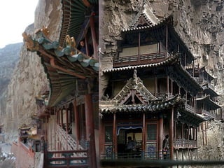 El Monasterio Suspendido Xuan Kong Si se construyó en el año 491 sobre un acantilado cerca de Datong, China. Está compuesto por diversos pabellones unidos por corredores y escaleras que se funden con el entorno natural. Más de 1400 años después, el monasterio aún sobrevive gracias a reconstrucciones durante las dinastías Ming y Qing, y es conocido por albergar elementos budistas, taoístas y confucionistas de manera inusual.