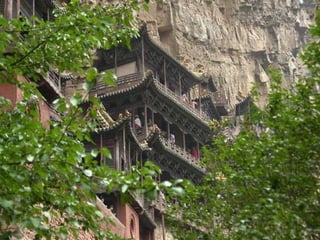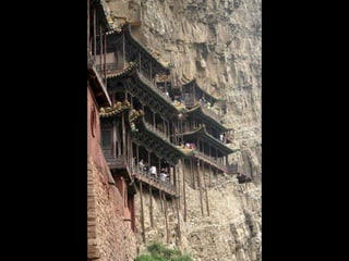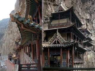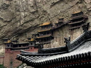 El Monasterio Suspendido Xuan Kong Si se construyó en el año 491 sobre un acantilado cerca de Datong, China. Está compuesto por diversos pabellones unidos por corredores y escaleras que se funden con el entorno natural. Alberga elementos budistas, taoístas y confucionistas de manera inusual. Ha sobrevivido más de 1500 años gracias a reconstrucciones durante las dinastías Ming y Qing.
