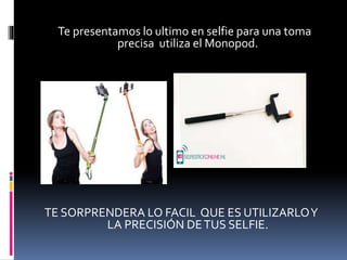 Este documento describe un monopod que permite tomar selfies de manera estable y precisa desde un smartphone de forma remota a través de Bluetooth. El monopod ofrece estabilidad adicional para las fotos y permite capturar selfies de ángulos más amplios. Se conecta fácilmente al smartphone por Bluetooth, tiene batería incorporada con hasta 100 horas de autonomía y es compatible con la mayoría de sistemas Android. Su costo varía entre 2.300 y 3.500 BsF dependiendo del tamaño y la marca.