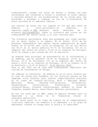 1) El documento habla sobre el fenómeno del mobbing o acoso laboral, el cual es una forma de violencia psicológica que ocurre en el lugar de trabajo de forma sistemática.