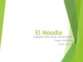 Moodle es una aplicación web de tipo ambiente educativo virtual creada por Martin Dougiamas para ayudar a los educadores a crear comunidades de aprendizaje en línea. Ofrece características de administración del sitio y cursos para personalizar el sitio y controlar las opciones de los cursos. Tiene ventajas como la participación de los alumnos en la creación de glosarios y enlaces automáticos, pero también desventajas como actividades mecánicas y problemas de seguridad y rendimiento dependiendo de la configuración y infraestruct