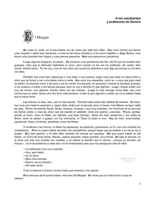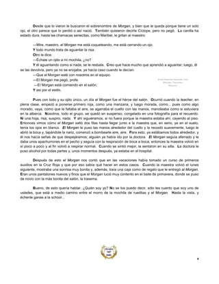 El documento relata la historia de un estudiante llamado Morgan que asistía a la secundaria. Morgan tenía un solo ojo y era objeto de burlas por parte de sus compañeros. Sin embargo, un día la maestra sufrió un ataque y Morgan fue quien la auxilió aplicándole primeros auxilios que había aprendido, salvándole la vida. Después de esto, Morgan ganó el respeto de sus compañeros y la maestra le regaló pantalones nuevos en agradecimiento. Morgan asistió al baile de primavera con la estudian