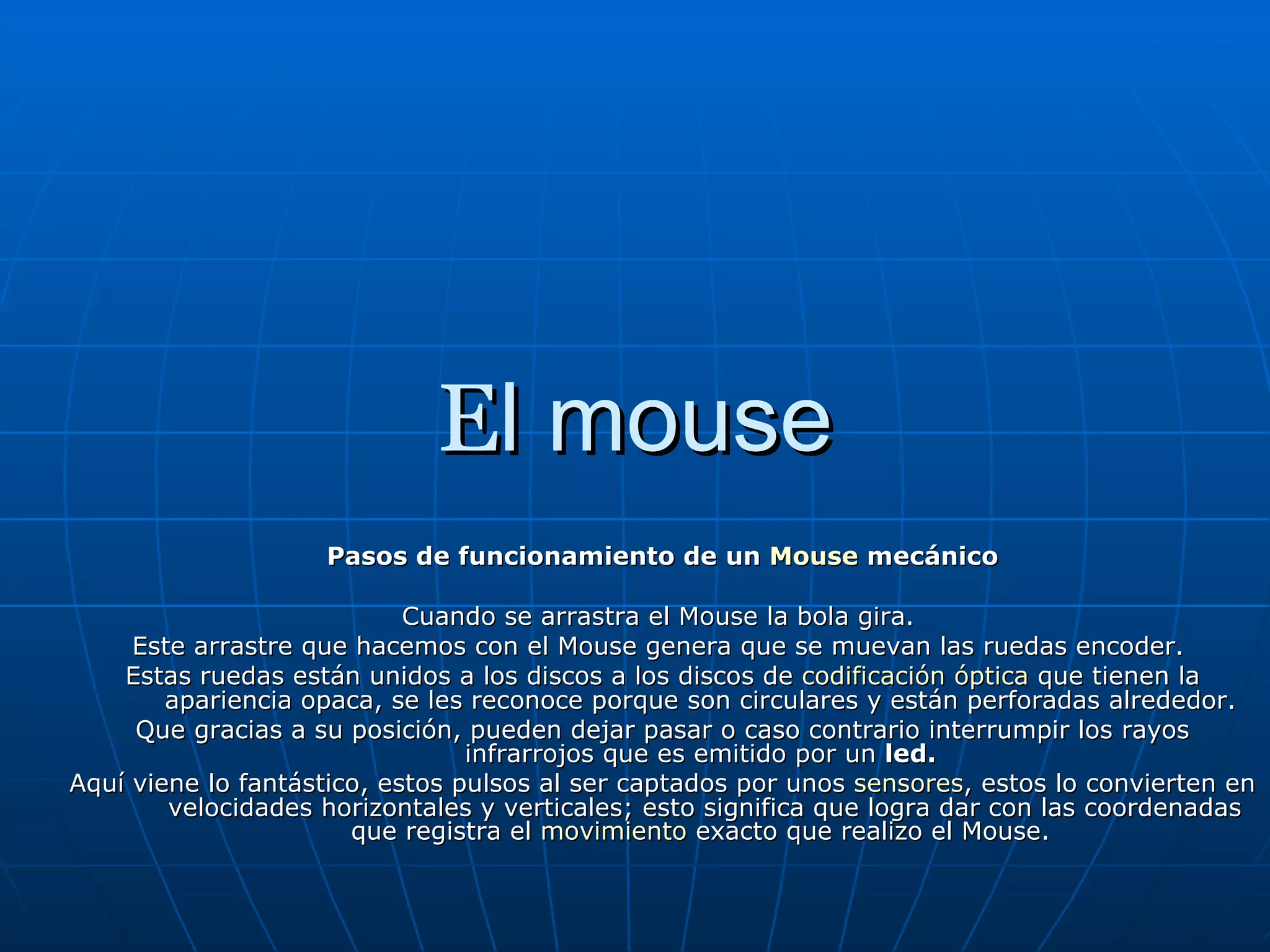 Cuando se arrastra un mouse mecánico, la bola gira y hace que se muevan las ruedas encoder unidas a los discos de codificación óptica que interrumpen o dejan pasar los rayos infrarrojos emitidos por un LED. Los sensores captan estos pulsos e infieren las velocidades horizontal y vertical del movimiento para registrar las coordenadas exactas del movimiento del mouse.