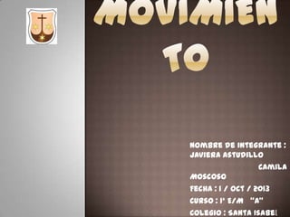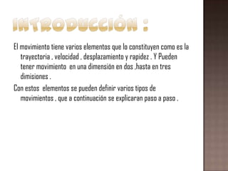 Este documento describe varios conceptos relacionados con el movimiento, incluyendo trayectoria, velocidad, desplazamiento y rapidez. Explica que el movimiento puede ocurrir en una, dos o tres dimensiones y define varios tipos de movimiento como movimiento rectilíneo y movimiento circular. También distingue entre rapidez y velocidad, señalando que la velocidad incluye tanto la rapidez como la dirección del movimiento.