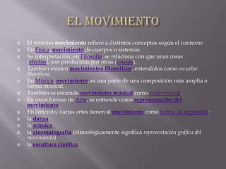 El documento define el término "movimiento" en diferentes contextos como la física, filosofía, música, arte, tácticas militares, ajedrez, sociología, ciencias políticas, demografía, economía y religión. En cada campo, movimiento se refiere a conceptos como el desplazamiento de cuerpos, causas y efectos, partes de composiciones musicales, estilos artísticos y musicales, desplazamientos de ejércitos y unidades, jugadas en juegos de mesa, cambios sociales y políticos, variaciones