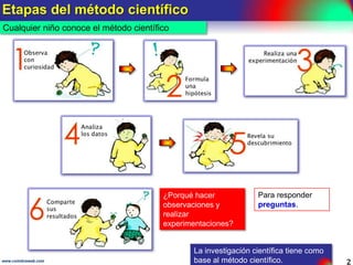 Este documento describe las etapas del método científico y cómo se organiza el manual de acuerdo a estas etapas. El manual está dividido en 6 partes que corresponden a las 6 etapas del método científico: 1) observación, 2) formulación de la hipótesis, 3) experimentación, 4) análisis de datos, 5) revelación de lo descubierto, y 6) reporte de resultados. Cada parte explica los conceptos y procesos involucrados en esa etapa particular del método científico para la investigación.