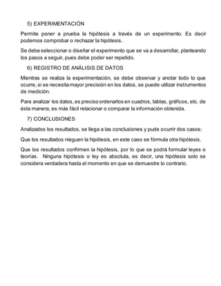 El método científico es un conjunto de pasos que incluyen la observación de un fenómeno, la formulación de preguntas y un problema, la recolección de datos, la construcción de una hipótesis, la experimentación para probar la hipótesis, el análisis de datos, y la conclusión de si los resultados confirman o niegan la hipótesis.