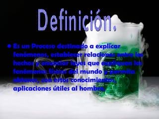 El documento describe el método científico como un proceso para explicar fenómenos del mundo a través de observaciones, la formulación de hipótesis y experimentos para probarlas, lo que permite establecer relaciones entre los hechos y enunciar leyes que pueden tener aplicaciones útiles. El método científico involucra observación, planteamiento de un problema, formulación de una hipótesis, predicciones experimentales y conclusiones.