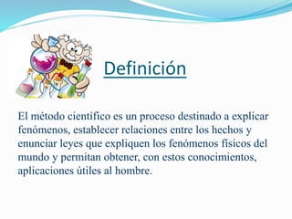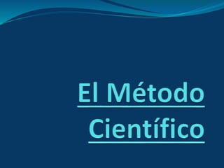 El documento describe el método científico, que incluye observación, planteamiento de un problema, formulación de una hipótesis, predicción, experimentación, conclusión y generalización. El método científico es un proceso para explicar fenómenos naturales estableciendo relaciones entre hechos observados y leyes que permitan aplicaciones útiles.