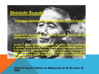 1. El método Suzuki de aprendizaje musical para niños fue creado por el pedagogo japonés Shinichi Suzuki y se centra en la participación activa de los padres, la educación temprana a partir de los 2 años, y el aprendizaje a través de la imitación y la práctica diaria.