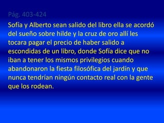 Este documento narra la historia de Sofía y Alberto después de salir del libro. Se encuentran en un mundo real donde no tienen los mismos privilegios que antes y no pueden interactuar con las personas. Buscan al Mayor Albert Knag para su cumpleaños y conocen a una anciana de 200 años que les cuenta su historia. Más tarde, observan al Mayor reunirse con su hija Hilde en el jardín, donde conversan sobre el universo, mientras que Sofía y Alberto solo los pueden escuchar sin ser vistos.