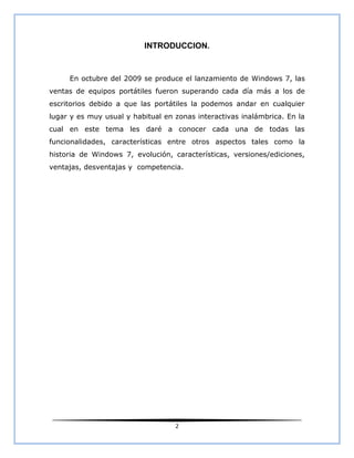 Este documento proporciona información sobre Windows 7, incluyendo su historia, características, versiones, ventajas y desventajas. Explica que Windows 7 es la sucesora de Windows Vista y mejora la interfaz de usuario. También describe las diferentes versiones de Windows 7 como Home Basic, Home Premium, Professional y Ultimate.