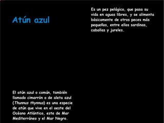 Este documento describe las características del atún azul o atún rojo, incluyendo su hábitat, alimentación, reproducción y problemas relacionados con la acumulación de mercurio. También discute los métodos tradicionales de pesca como la pesca de brumeo y de almadraba, y destaca que las poblaciones de atún rojo han disminuido debido a la sobrepesca a pesar de las medidas de conservación. La mayor amenaza actual para el atún rojo del Atlántico es la pesca ilegal en el Mediterráneo
