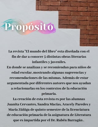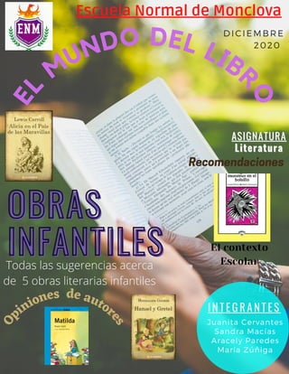 Este documento presenta resúmenes y recomendaciones de 5 obras literarias infantiles: Matilda de Roald Dahl, Tengo un Monstruo en el Bolsillo, Hansel y Gretel, Alicia en el País de las Maravillas y Mujercitas. Analiza cada obra desde diferentes perspectivas como su contexto, temas, adecuación para niños y más. El objetivo es dar a conocer estas obras y mostrar su valor para la educación primaria.