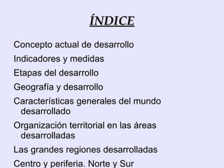 El documento discute el concepto de desarrollo y subdesarrollo. Explica que el desarrollo se refiere al crecimiento económico, pero también a mejoras en la calidad de vida de las personas a través de la educación y la salud. Analiza las etapas del desarrollo según Rostow y las teorías de la dependencia. También describe los indicadores comunes para medir el desarrollo, como el PIB y el Índice de Desarrollo Humano del PNUD.