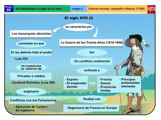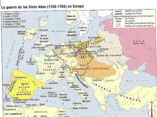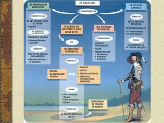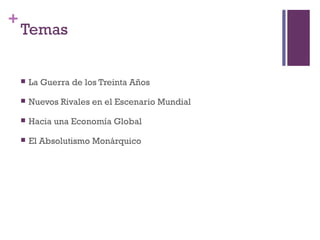 1) La Guerra de los Treinta Años (1618-1648) asoló Europa central y tuvo como causas problemas religiosos. 2) Surgieron nuevos rivales como Francia, Gran Bretaña e imperios como los Mogules en la India y los Qing en China. 3) El comercio global creció gracias al mercantilismo y la expansión colonial europea en América, África y Asia.