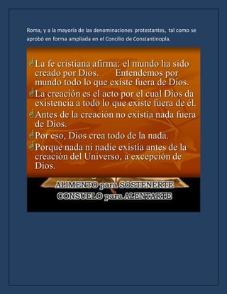 El documento habla sobre el Credo de los Apóstoles y el Credo Niceno-Constantinopolitano, que son las profesiones de fe cristiana común a la iglesia Católica y a otras denominaciones. También discute las diferencias entre el sábado judío y el domingo cristiano como día de descanso y adoración, y cómo el séptimo día de la creación simboliza el día de acción de gracias a Dios, mientras que el octavo día representa la nueva creación en Cristo a través de su resurrección.
