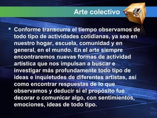 Este documento describe el arte colectivo y los murales. Explica que el arte colectivo es creado por grupos de artistas guiados por una idea original. Los murales son pinturas grandes en paredes y fueron practicadas por culturas antiguas como los egipcios, griegos y romanos. También culturas prehispánicas en México crearon murales. Miguel Ángel fue pionero de los murales renacentistas al pintar la Capilla Sixtina. El documento invita a investigar sobre el tema de los murales y provee ej