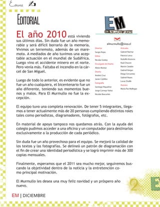El documento resume el año 2010 para el periódico escolar "El Murmullo". Fue un año memorable marcado por varios eventos notables como el terremoto de febrero, el mundial de fútbol en Sudáfrica, el accidente minero en el norte de Chile y el incendio en la cárcel de San Miguel. El periódico también tuvo un año provechoso con la renovación del equipo y la mejora de la calidad periodística. Para el 2011, el periódico buscará mantener la objetividad y entretener a los lect