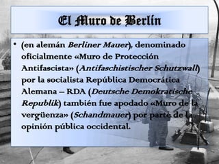 El Muro de Berlín separó a Berlín en dos sectores desde 1961 hasta 1989, dividiendo a Alemania del Este de Alemania del Occidental. Construido por la República Democrática Alemana, oficialmente para "proteger" a su población de elementos fascistas, el muro en realidad sirvió para impedir la emigración masiva hacia Occidente. Muchas personas murieron intentando cruzar el muro, vigilado estrechamente por guardias fronterizos de Alemania del Este. Finalmente, el muro cayó en 1989 debido a las demandas