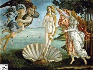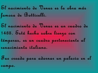 Este documento resume la obra maestra renacentista de Botticelli "El nacimiento de Venus". Representa la llegada de Venus a la isla de Cítera después de nacer del mar, acompañada por Céfiro y Cloris que la empujan con el viento y una ninfa de la primavera que la cubre con flores. El cuadro destacó en su época por representar a una diosa pagana desnuda y por el uso pionero de líneas diagonales que le dan profundidad.