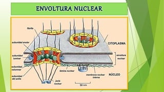 El documento describe las características y funciones del núcleo celular. El núcleo contiene la mayor parte del material genético de la célula en forma de ADN organizado en cromosomas. El núcleo mantiene la integridad del material genético y controla la expresión génica a través de la transcripción y transporte de moléculas. Los poros nucleares permiten el paso de sustancias entre el núcleo y el citoplasma.
