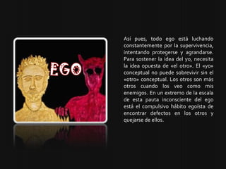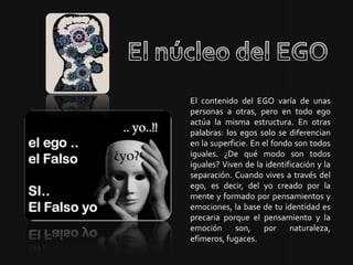 El documento describe cómo el ego de todas las personas se basa en la identificación y separación, viviendo a través de pensamientos y emociones efímeros. Para sobrevivir, el ego necesita sentirse separado de "los otros" y constantemente intenta protegerse y agrandarse a sí mismo, a menudo mediante quejas y etiquetas negativas sobre otras personas. Estas estrategias del ego van desde quejas e insultos hasta gritos, violencia física y encontrar defectos en los demás.