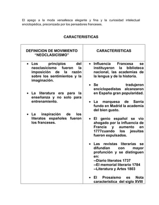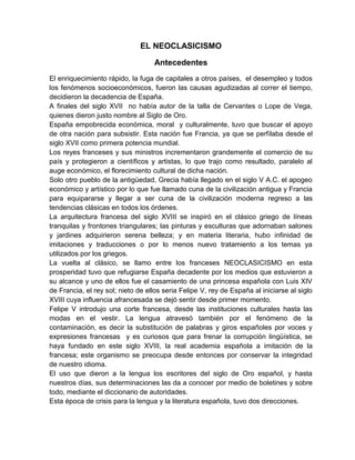 El documento describe el Neoclasicismo en España. Tras la decadencia económica y cultural de España a finales del siglo XVII, España buscó apoyo en Francia, que se estaba convirtiendo en una potencia mundial. Francia fomentó el florecimiento cultural del Neoclasicismo, inspirado en la antigua Grecia. Felipe V de España introdujo modas y costumbres francesas en el siglo XVIII, incluyendo la contaminación de la lengua española con palabras francesas. El Neoclasicismo en España estuvo marcado