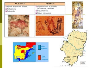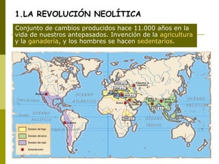 El documento describe los principales cambios del Neolítico y la Edad de los Metales, incluyendo la revolución neolítica con la invención de la agricultura y la ganadería que llevó a los humanos a establecerse, las especies cultivadas y domesticadas, el desarrollo de la metalurgia con cobre y bronce, las creencias religiosas como la Diosa Madre de la fertilidad, y el arte rupestre y megalítico.