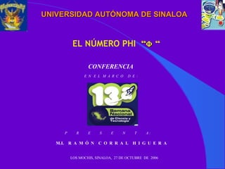 Este documento presenta una conferencia sobre el número de oro (φ), representado por la letra griega φ. Explica que fue introducido por Euclides para describir una división proporcional de un segmento, lo que dio como resultado la ecuación x^2-x-1=0 con soluciones de 1.618033989 y 0.618033989. Más tarde, en el siglo XV, este número pasó a llamarse la divina proporción o proporción de oro.