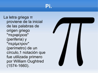 π es la relación entre la longitud de una circunferencia y su diámetro. Es un número irracional y constante matemática importante. A lo largo de la historia, los científicos han buscado calcular más decimales de π. En el Renacimiento europeo, matemáticos como Fibonacci y Viète usaron polígonos para aproximar π con mayor precisión. El 14 de marzo se celebra como el día de π.