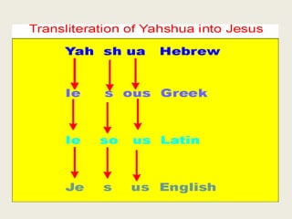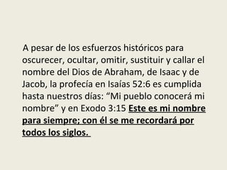 El documento aborda la importancia del nombre de Dios en la tradición judeocristiana, resaltando la revelación del nombre YHWH en las escrituras y cómo su pronunciación ha sido distorsionada a lo largo de la historia. Se discute la omisión, sustitución y prohibición del nombre de Dios, así como el cumplimiento de la profecía que indica que Su pueblo conocerá Su nombre. Además, se critica la tendencia a reemplazar el nombre divino por títulos y se enfatiza la necesidad de reconocer y usar correctamente el nombre YHWH.