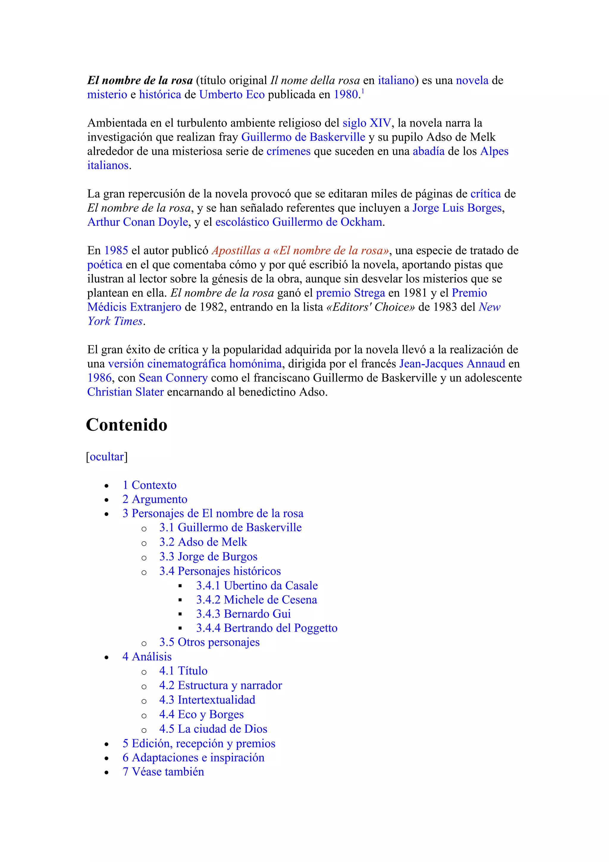Este documento resume la trama de la novela El nombre de la rosa de Umberto Eco. Narra la investigación que realizan el franciscano Guillermo de Baskerville y su pupilo Adso de Melk sobre una serie de misteriosas muertes ocurridas en una abadía benedictina italiana en 1327. Al descubrir que las muertes están relacionadas con un libro prohibido de Aristóteles, Guillermo debe enfrentar el fanatismo religioso representado por el bibliotecario Jorge de Burgos. La llegada del inquisidor