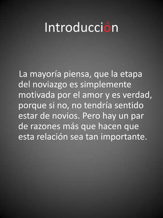 El documento habla sobre el noviazgo desde una perspectiva cristiana. Explica que el noviazgo debe preparar a la pareja para el compromiso del matrimonio y que es importante encontrar a alguien que comparta la misma fe. También da consejos bíblicos como no involucrarse sexualmente, amar a Dios sobre todas las cosas, y honrar a los padres.