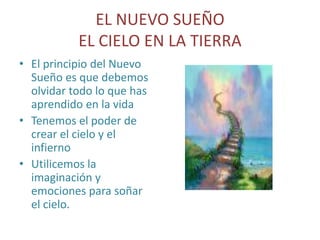 El documento habla sobre el concepto del "Nuevo Sueño" y crear el "Cielo en la Tierra". Propone que debemos usar nuestra imaginación y emociones para soñar y crear el cielo, olvidando todo lo aprendido. También sugiere que tenemos el poder de elegir vivir en el cielo o el infierno, y que solo el amor puede darnos dicha y hacernos ver que el cielo existe en la tierra.