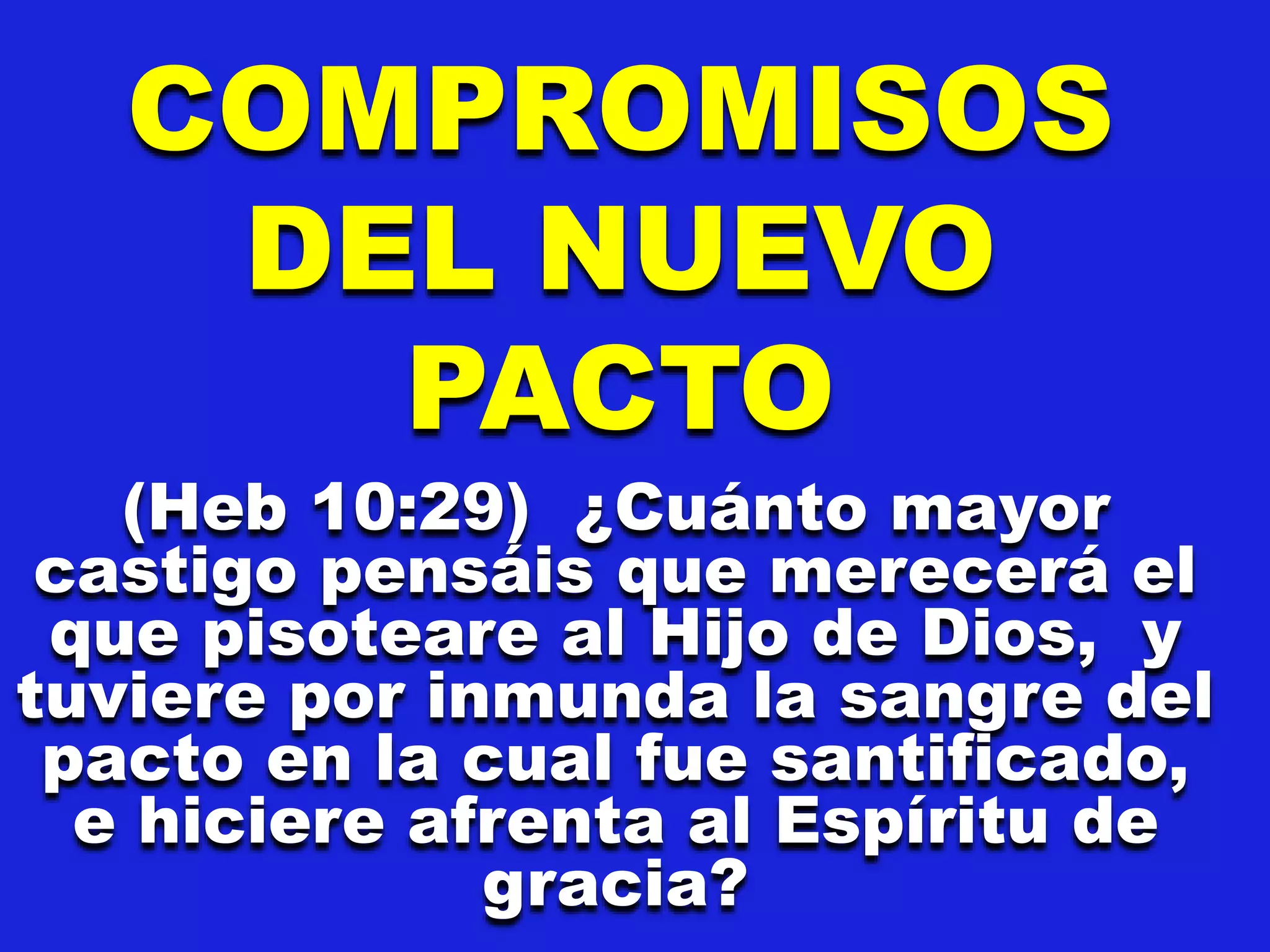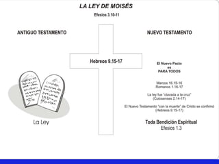El documento resume los principales compromisos del nuevo pacto establecido por Dios con la humanidad. Estos incluyen: 1) quitar el pecado de su pueblo, 2) hacer a los creyentes ministros competentes del nuevo pacto, y 3) poner sus leyes en los corazones de los creyentes. También describe los compromisos de los creyentes en el nuevo pacto como acercarse a Dios por medio de Cristo, mantener firme su profesión de fe y congregarse como comunidad de pacto.
